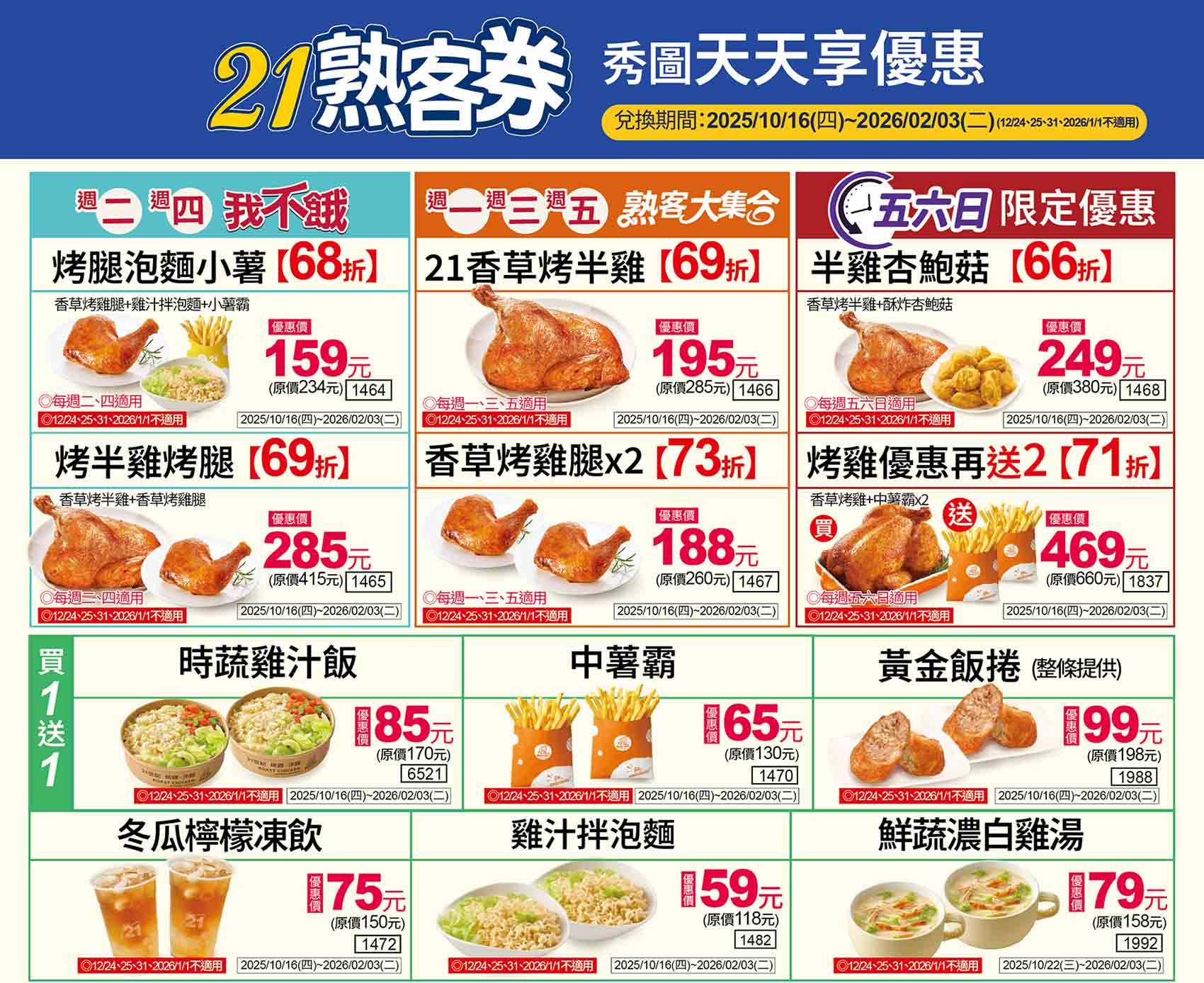 半雞菇菇餐敲碗回歸66折、香草烤雞買1送2爽爽吃