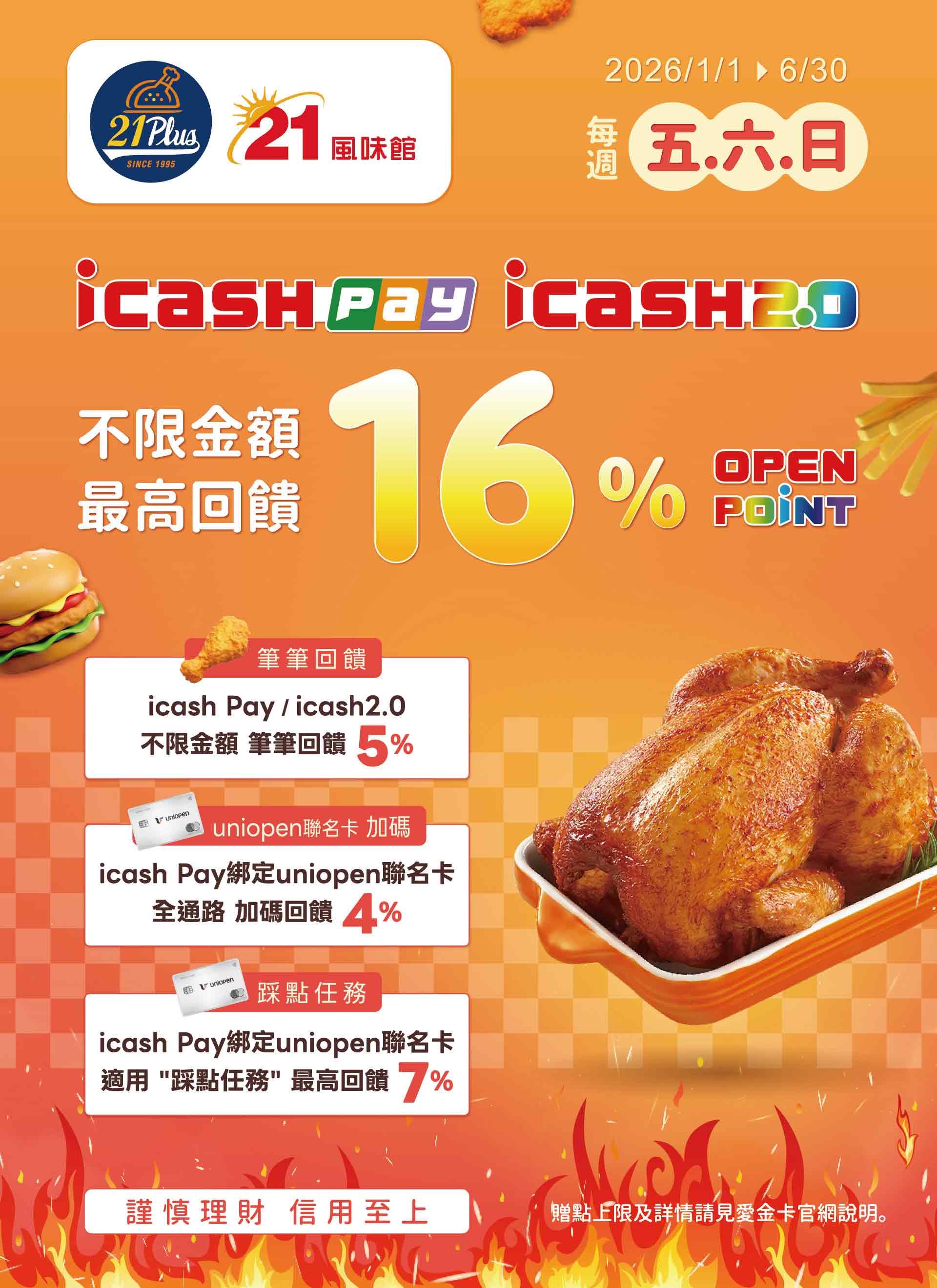 活動期間每週五、六、日使用icash2.0或icash Pay支付,享支付金額筆筆5% OPENPOINT回饋,