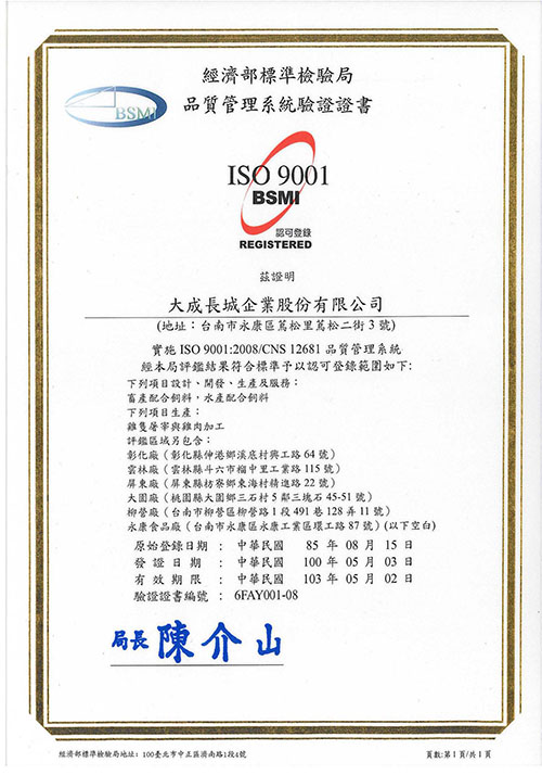本公司與大成長城公司合作,提供消費者新鮮、健康、安全、美味與優質之雞肉。毛雞飼養過程中,提供自動化餵食、恆溫環境嚴格管理,讓雞隻在舒適無毒的環境下,健康成長。飼糧經過專業團隊研發,並通過TAF認證實驗室(大成品檢中心),領先同業引進LC/MS/MS等精密儀器層層把關,以確保原料、營養飼糧之安全無虞。除了從源頭嚴格品質控管以外,在電宰方面,也通過政府單位駐廠獸醫師把關及國家認證。溯源資訊公開透明,層層把關,大成全程用心,讓您食在安心。
